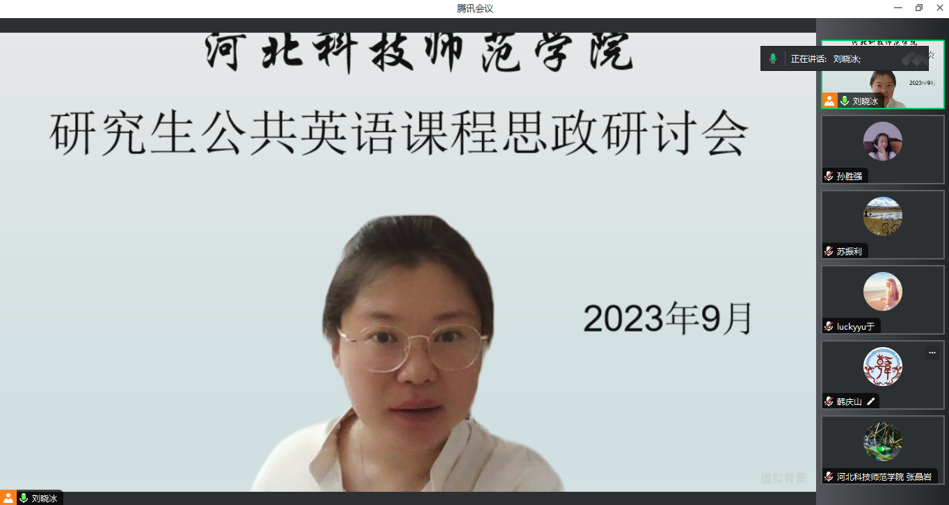 2023年9月8日必赢242net官网学科教学(英语)教学部组织硕士研究生公共英语(第一外国语)任课教师开展教学研讨活动,会议主题围绕研究生公共英语课程思政展开,研讨内容包括:针对教材的各个章节选出精讲主题和配套的练习,任课教师可以根据学生的具体专业情况灵活把握课程思政的切入点,可以利用超星学习通教学平台布置英语词汇、小组活动及主题作业等学习任务,并积极开展课程思政。