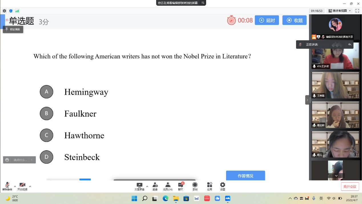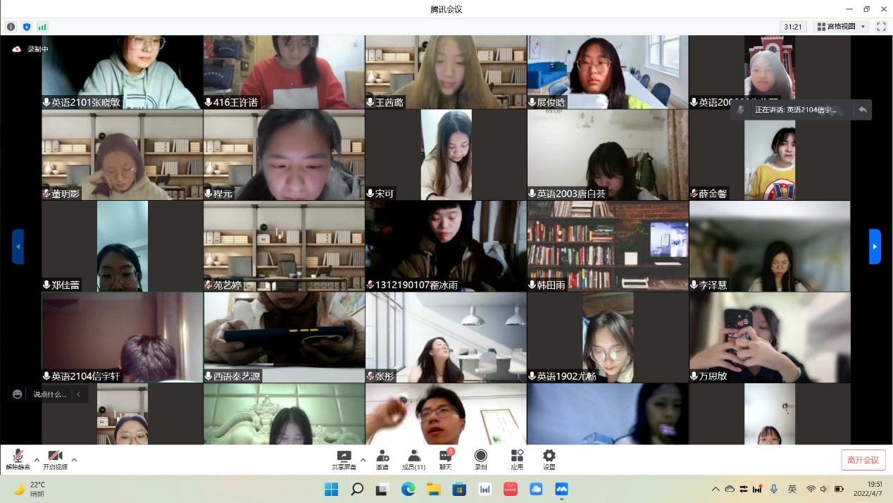 为了提高外语学子的文学素养,丰富学生的课余生活,4月7日下午,必赢242net官网以线上会议形式举办第一届“畅游文学,横贯中外”中西文学知识竞赛,本次竞赛由《中学英语》外编社承办,外编社指导老师周鹏宇作为嘉宾出席本次竞赛。