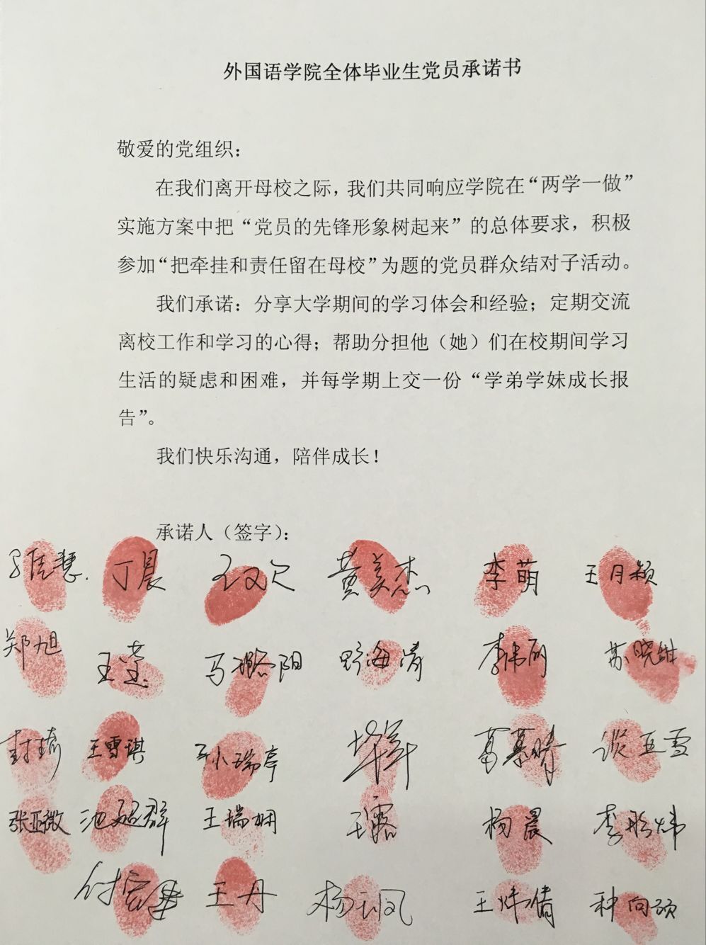 会上,学院党委副书记、副院长范群英带领全体毕业生党员共同学习了习近平总书记对李保国同志先进事迹的重要批示,要求每一个毕业生党员都要以李保国同志为榜样,发扬心系群众、扎实苦干、奋发作为、无私奉献的高尚精神,在以后的工作岗位上不忘入党誓词,明辨是非,发挥党员先锋模范作用,不怕苦、不怕累,不断开拓创新,在平凡的岗位上为社会创造更大的价值。之后,学工办主任田辉根据党委要求,布置以“把责任和牵挂留给母校”为主题的党员群众结对子活动。活动要求每一个毕业生党员联系一名在校学生,分享毕业生党员大学期间的学习经验,交流离校后的工作和学习体会和心得;帮助学弟学妹们处理在校期间遇到的学习和生活上的疑虑和困难,并每学期上交一份“学弟学妹成长报告”。全体毕业生党员都表示,要发扬李保国同志“太行山上的新愚公”精神,并响应学院党委的要求和号召,无论身在何处,身系学弟学妹的成长,为学院的发展贡献绵薄之力。最后,全体毕业生党员签订了活动承诺书。