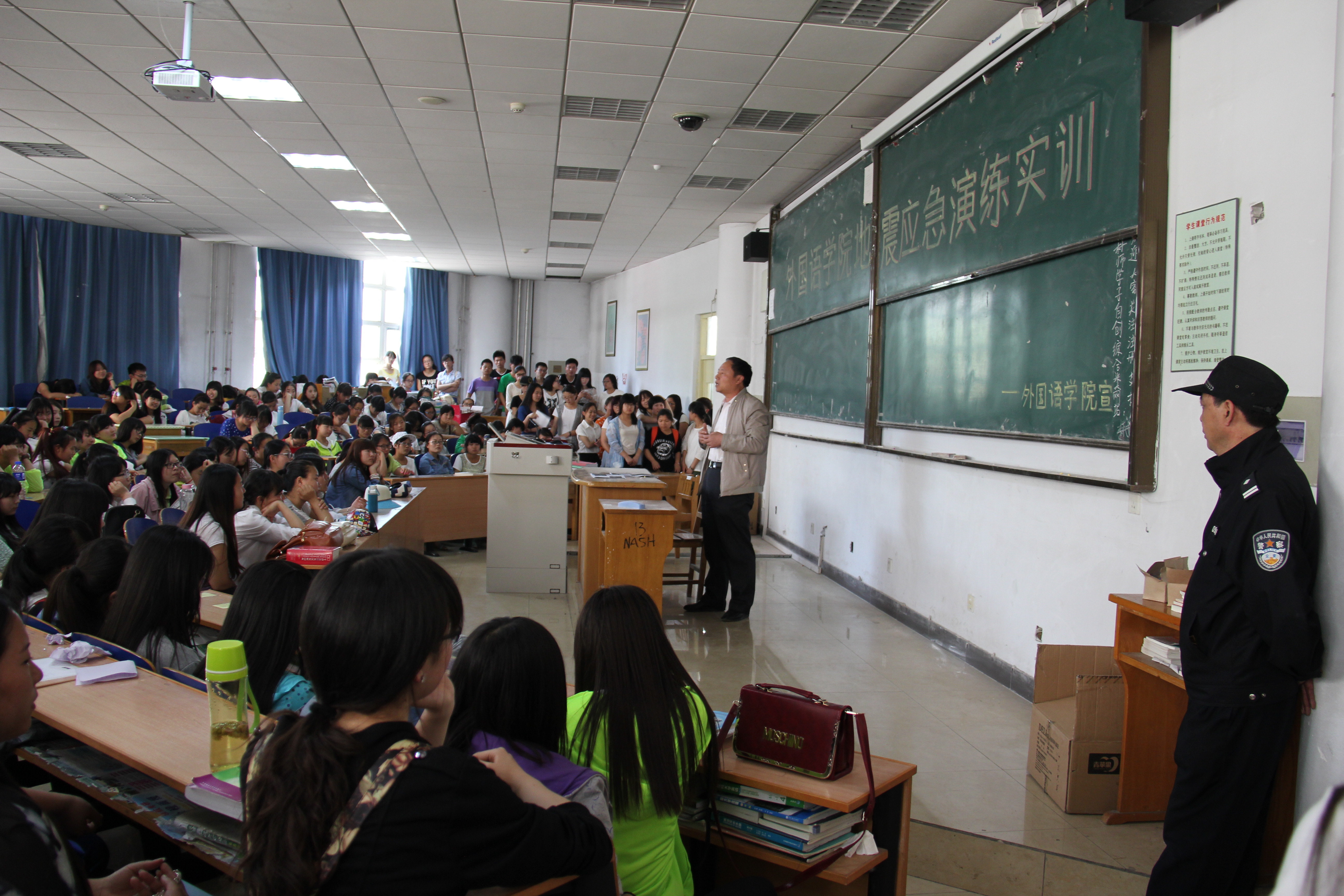 为落实学校《星级“平安校园”建设工作实施方案》,响应学校和保卫处关于开展地震应急演练活动的通知要求,必赢242net官网于5月21日中午集中进行地震应急演练和紧急疏散演习。活动邀请到保卫处副处长张明权老师和张明前科长对地震应急和紧急疏散的知识和技术要领进行培训。张明权老师首先详细讲解了学生处于教室、宿舍和公共场所时,如何观察周围环境,寻找避震场所和逃生通道。同时,对学生们进行自救和互救环节的要点进行了指导。之后,必赢242net官网地震应急演练正式开始。组织教师发出“发生地震了”的指令后,告知学生“地震了,不要慌,快避震”,要求学生保持镇静,头脑清醒,就近躲在安全的位置,并及时打开教室两侧通道。在短暂的避震后,组织老师指挥学生,分三个方向有序通过教学楼门口疏散逃生到楼外空旷的广场。最后,参加演练的班级清点人数后,宣布地震紧急演练结束。本次地震应急演练和紧急疏散演习不但提高了师生的安全意识,提高了大家安全防范意识和应对突发事件的能力。一名参加演习的学生活动结束后说,通过参加这场演习,让自己应对突发事件时有了一定的心理准备,听从现场指挥,及时寻找安全通道,并在自救的基础上实现互帮互救。