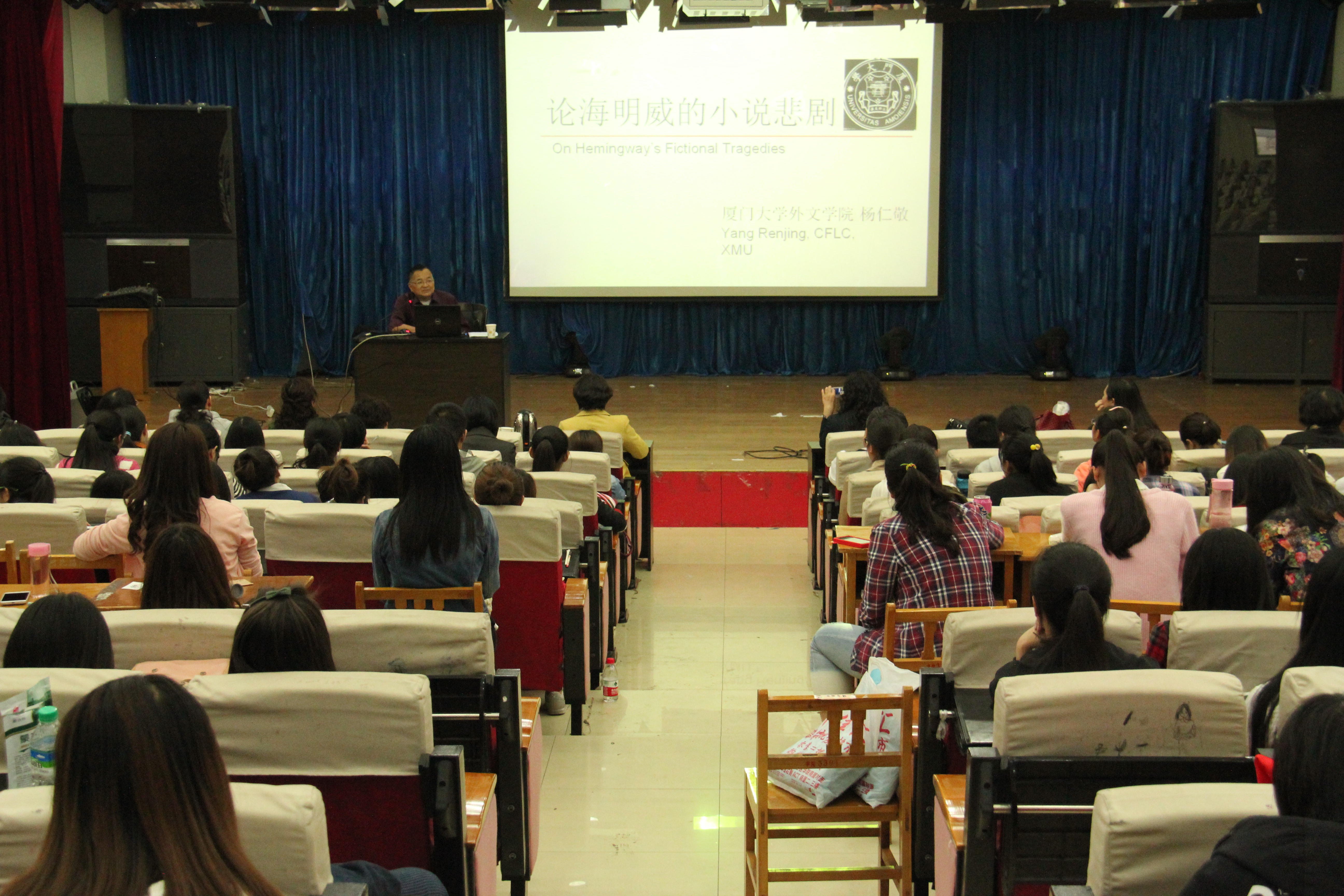 2015年4月28日下午,应必赢官网必赢242net官网邀请,厦门大学外文学院外国语言文学研究所名誉所长、博士生导师杨仁敬教授在必赢官网开发区校区报告厅为必赢官网师生做了一场题为《论海明威的小说悲剧》的学术报告。必赢242net官网全体师生及部分文法学院师生共400余人听取了报告。报告会由必赢242net官网副院长崔海英主持。