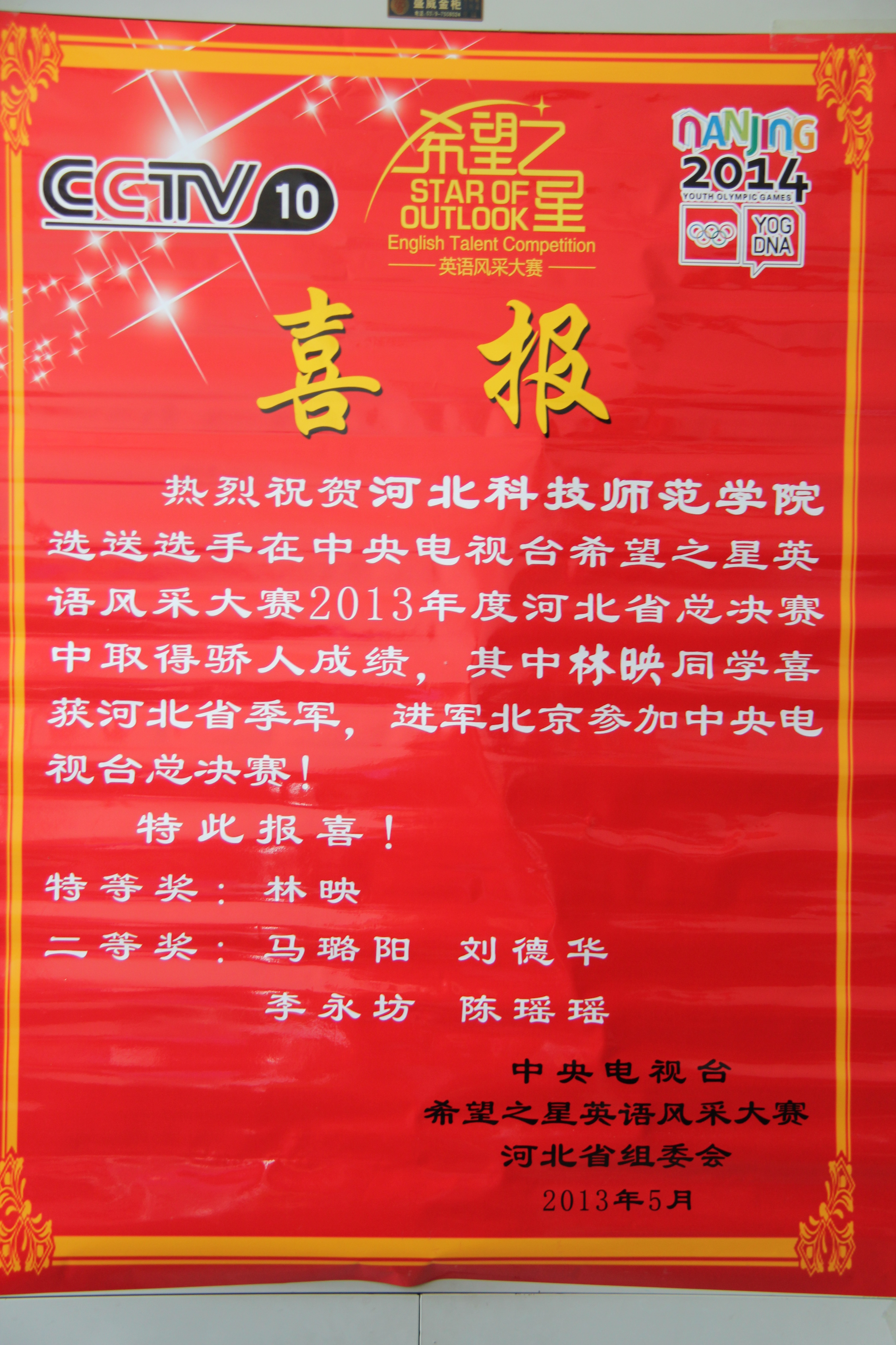 必赢官网选手在河北省希望之星英语风采大赛总决赛中表现优异,其中必赢242net官网学生林映获得河北省季军,将进军北京中央电视台参加总决赛。另有马璐阳、刘德华、李永坊、陈瑶瑶四名同学获得二等奖。