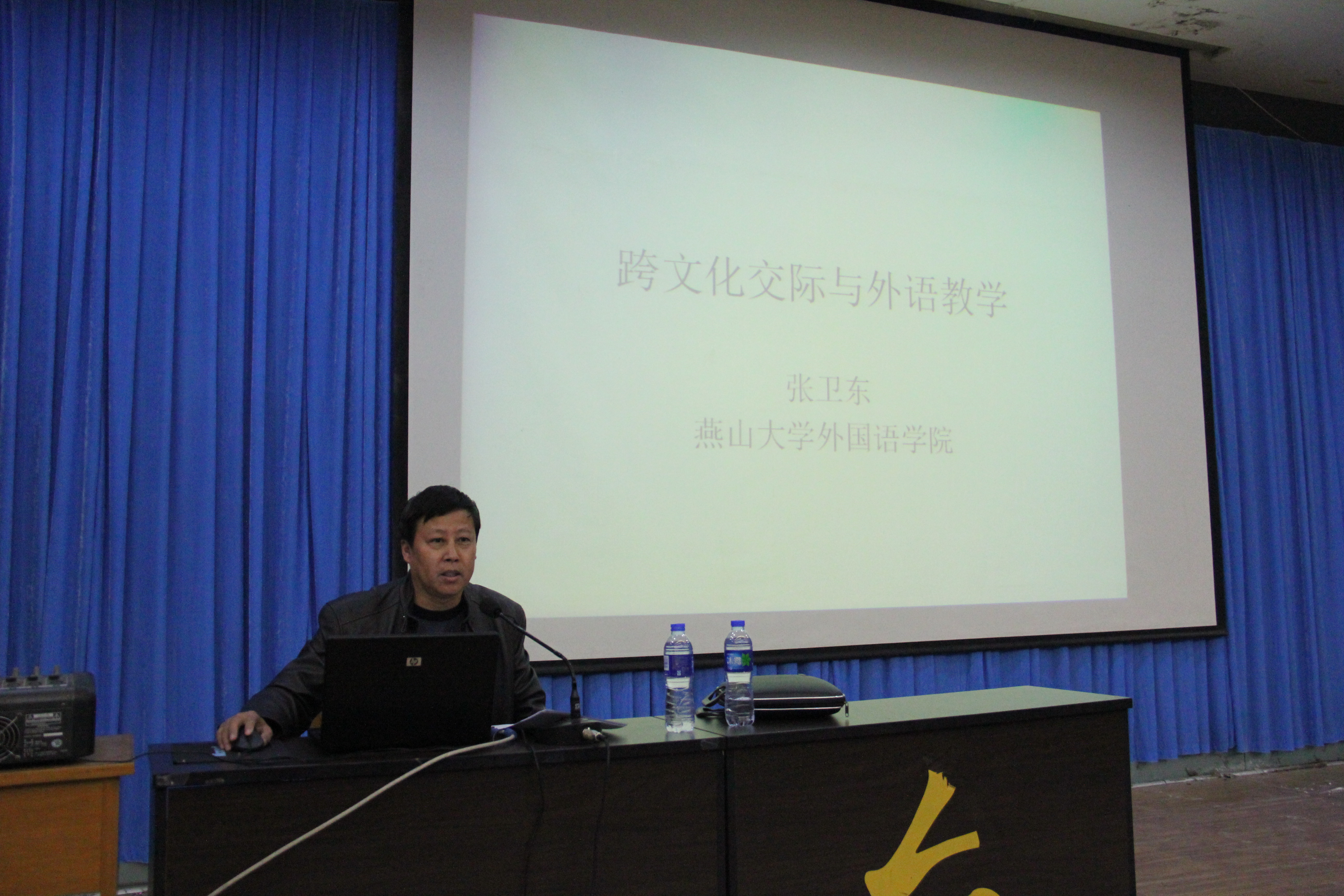 应必赢官网邀请,燕山大学必赢242net官网党委书记张卫东教授于2012年11月8日来必赢官网讲学。张教授是跨文化交际领域的知名学者,此次来必赢官网为广大师生做了题为《跨文化交际与外语教学》的专题讲座。