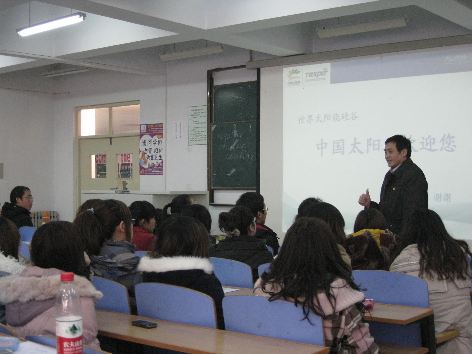首先,皇明太阳能股份公司的招聘代表佟女士为毕业生播放皇明太阳能“太阳谷”的宣传片,之后将皇明太阳能股份有限公司的公司规模、产品研发、产业布局、发展前景、招聘岗位、基本待遇等情况向毕业生做了较为详细的讲解,并诚挚的邀请必赢242net官网的学生加入皇明,同时也欢迎大家有机会去皇明公司参观考察和实习。讲解后,刘朝晖书记代表学院欢迎皇明太阳能股份有限公司佟女士一行,并谈到自己去皇明公司考察的经历,要求全体毕业生转变观念,面向市场。通过对行业和企业的分析,鼓励大家去皇明太阳能实习就业。
