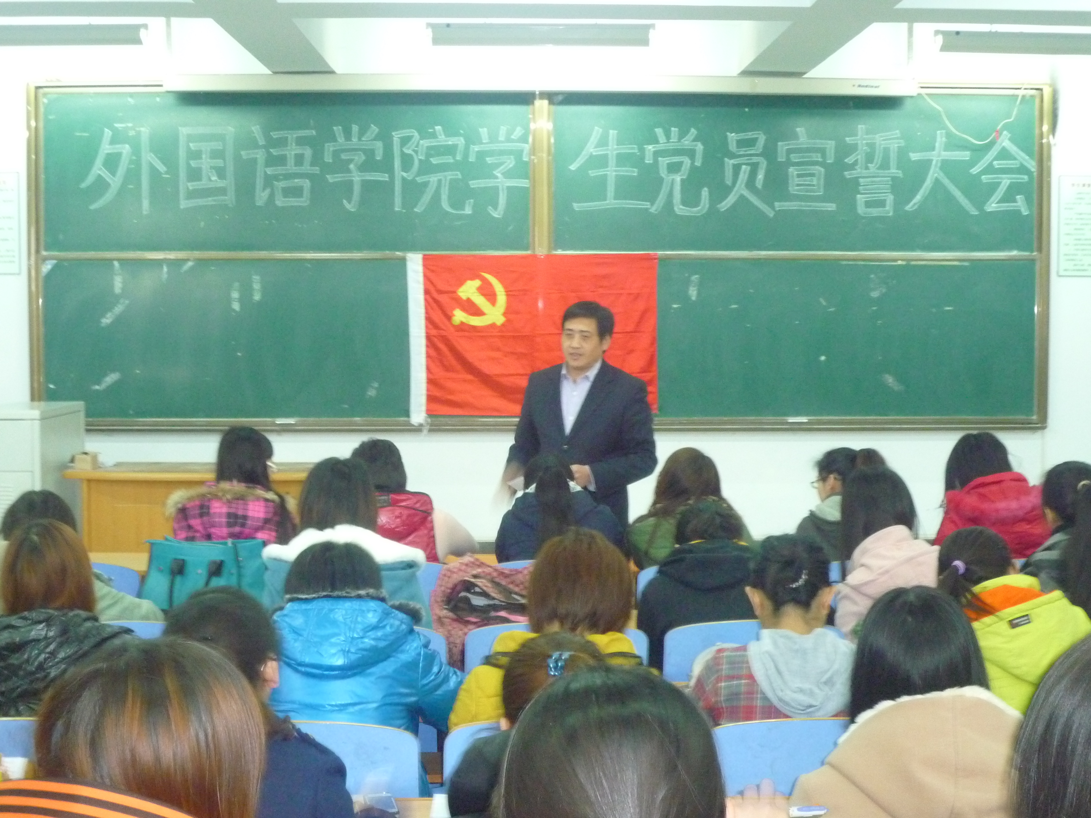 为了加强学生党员党性,深化学生党员的理论学习,2012年3月22日中午国语学院学生党支部在312教室召开了学生党员宣誓大会,会议由学生支部书记田辉同志主持,必赢242net官网党总支书记刘朝晖同志、团委书记李一尘同志和全体学生党员参加。