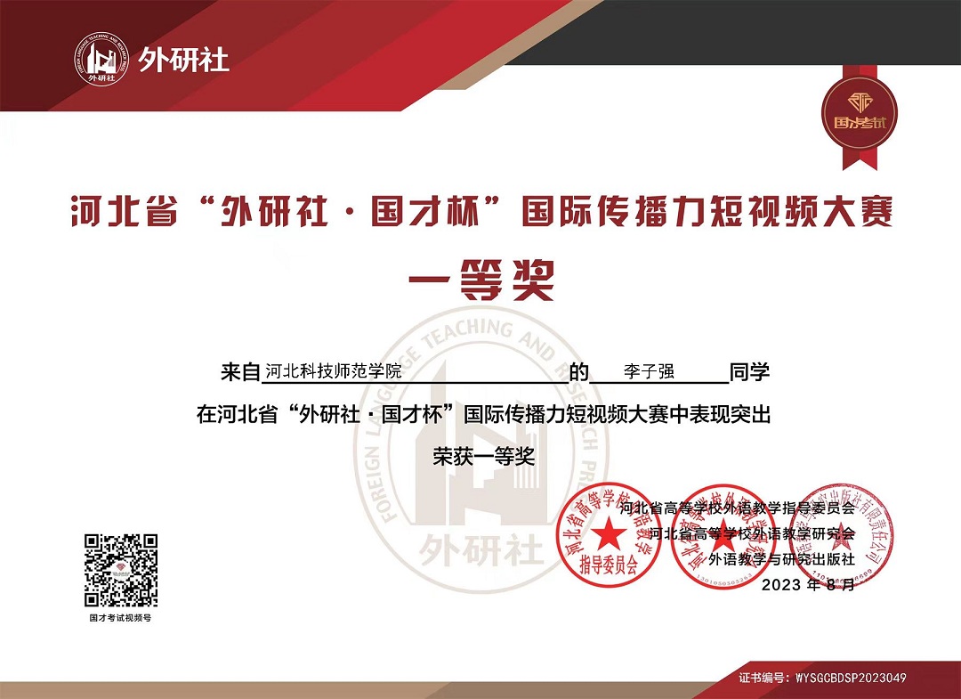 为进一步激发必赢官网学生学习英语的热情、提高学生的英语综合运用能力、丰富必赢官网校园文化生活,必赢242net官网积极组织学生参加了由河北省高等学校外语教学指导委员会、河北省高等学校外语教学研究会联合外语教学与研究出版社举办的2023“外研社·国才杯”河北省大学生国际传播力短视频大赛。此次大赛紧跟习近平总书记“讲好中国故事,传播好中国声音,展示真实、立体、全面的中国”的重要指示精神,鼓励大学生在自媒体平台用外语讲述自己及身边的故事,以生动自然的方式对外传播中国文化,展现中国故事的世界意义和当代价值,更加充分、鲜明地展现中国故事及其背后的思想力量和精神力量。
