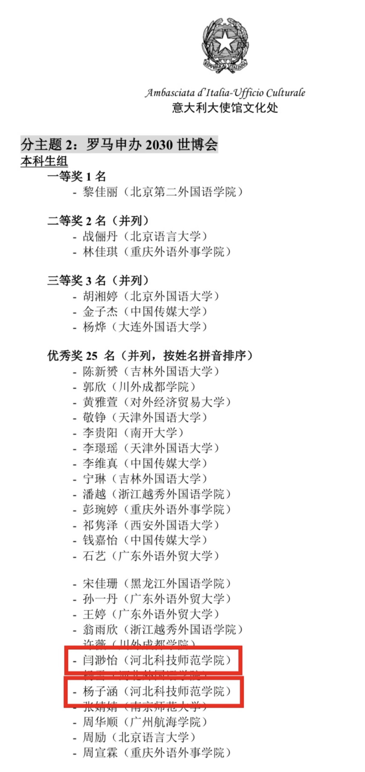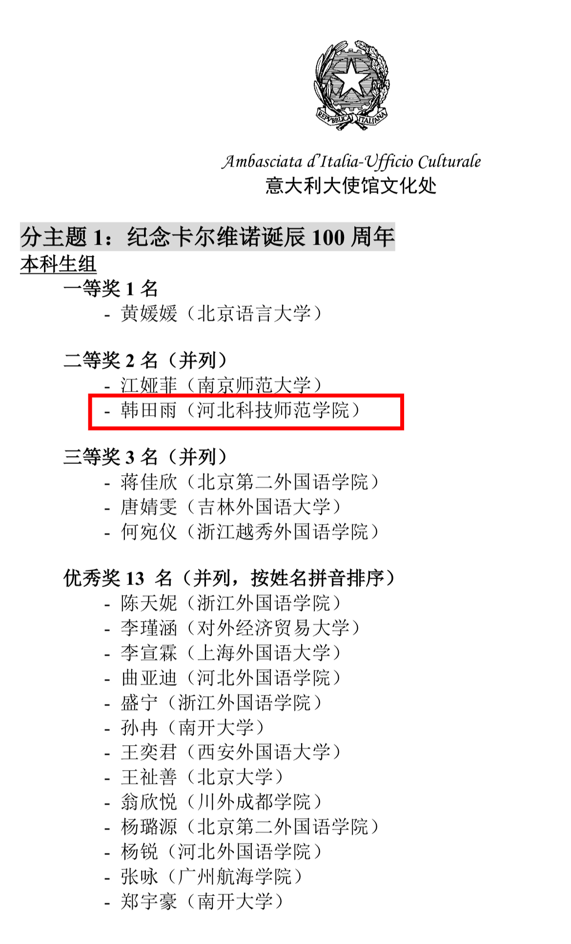 近日,2023年第八届全国“ITALIA CIAO/意大利语桥”大赛圆满落幕,本届大赛的总主题为:意大利语与可持续性,下设“纪念卡尔维诺诞辰100周年”与“罗马申办2030世博会”两个分主题,以写作大赛的形式举行。本次比赛有来自北京外国语大学、上海外国语大学、广东外语外贸大学、南开大学等23所高校的74名学生参赛(其中本科生组50名,硕士生组24名)。必赢官网选手韩田雨同学,凭借扎实的意大利语专业能力,荣获本科生组二等奖。必赢官网另外两名选手闫渺怡、杨子涵获得优秀奖。