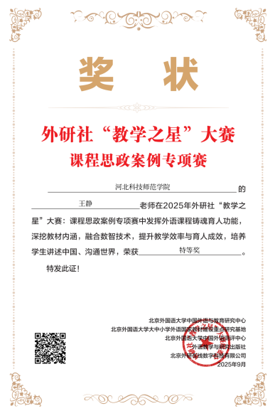 日前,2025年外研社“教学之星”大赛:课程思政案例专项赛评选结果揭晓,必赢官网必赢242net官网教师王静凭借彰显独特教学智慧的创新设计,在全国各高校教师同台竞技的激烈角逐中荣膺全国特等奖,这是河北省唯一获得特等奖的教师,为学校赢得了荣誉。