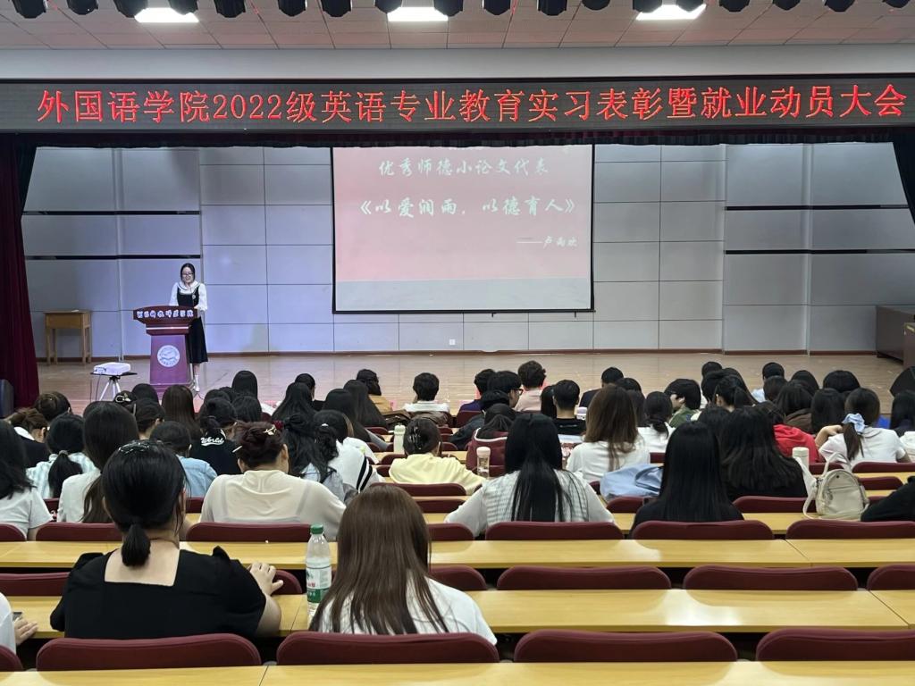 2025年9月25日,必赢242net官网英语专业教育实习表彰暨就业动员大会在多功能厅圆满召开,该专业2022级全体同学以及部分2023级学生参加了大会。此次大会全面回顾了上个学期的教育实习成果,表彰了在实习期间表现优异的同学,为师生提供了分享经验、交流心得的平台,并对大家今后的就业指明了方向,进一步推动了师范生培养质量的提升。