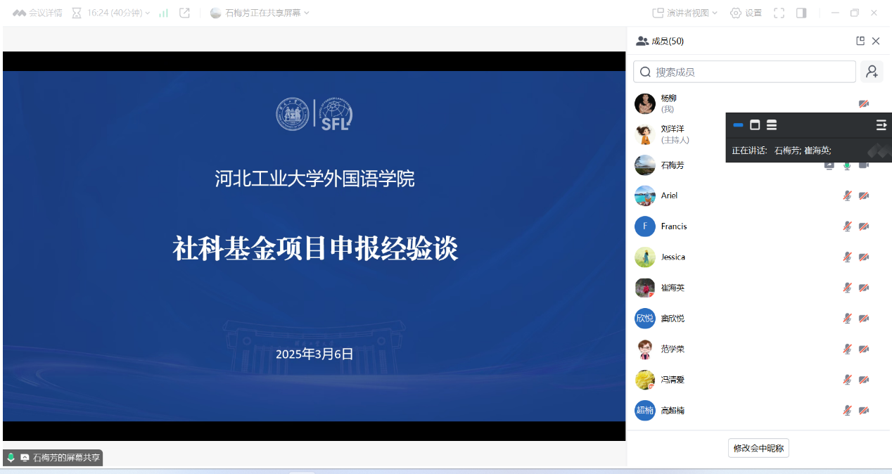 2025年3月6日,必赢官网举办“2025年度国家(省)社科基金项目申报专题讲座(十一) ”系列活动,邀请河北工业大学必赢242net官网石梅芳教授作题为《社科成果奖申报经验分享》的专题讲座,崔海英院长主持会议,全体教师及在读研究生参会。